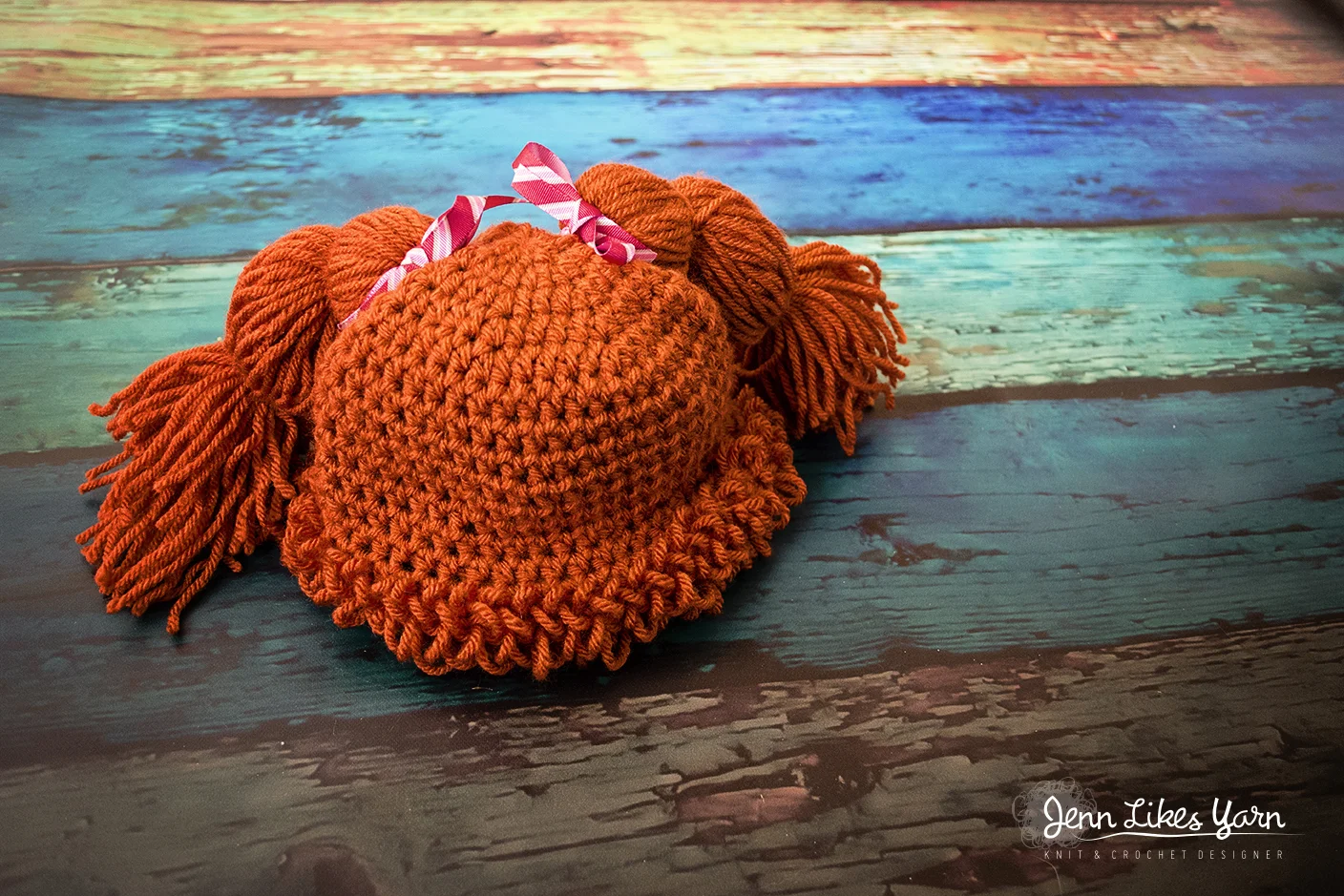 Ahoy, mateys! Here be my latest creation: another pigtail beanie, this time in orange. I hadn't made one for a redhead yet and I'm loving it; in fact, I've been inspired to try a Pippi Longstocking-inspired version one of these days, with crazy braided pigtails using pipe cleaners.