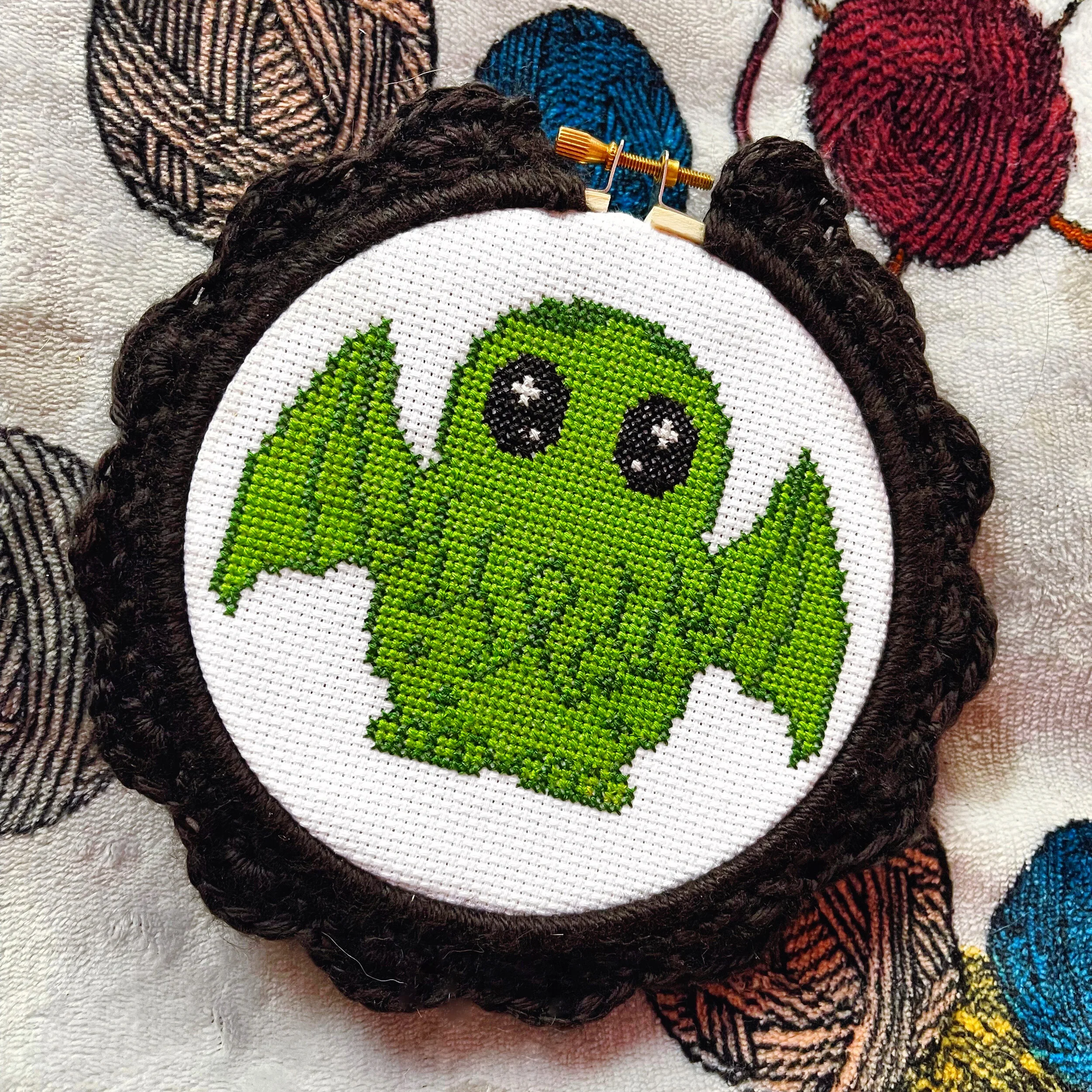 Last Christmas, I gave Scott this Cthulhu cross stitch kit that I purchased from Spot Your Colors on Etsy. It may have taken a full seven months, but I finally sat down this week to wrap up our little green baby.