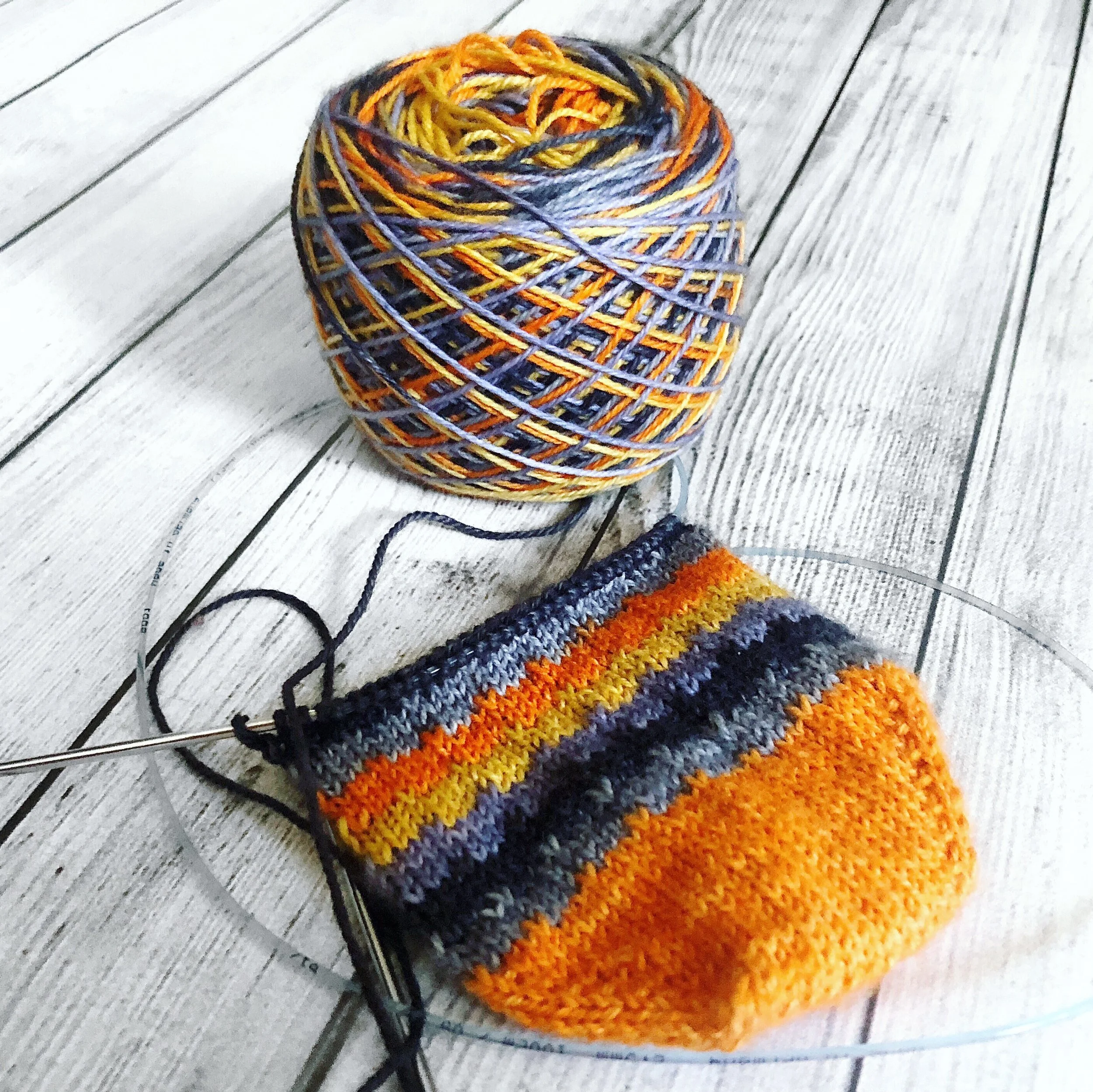 One pair of Halloween socks I started (but never finished) knitting in The Cozy Knitter’s “Haunted” colorway.